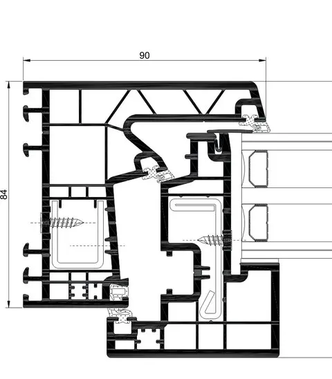 cujo valor de transmissão Uf parte de 1,11 W/m²K, permite um elemento central de 90 mm que iguala a secção lateral.