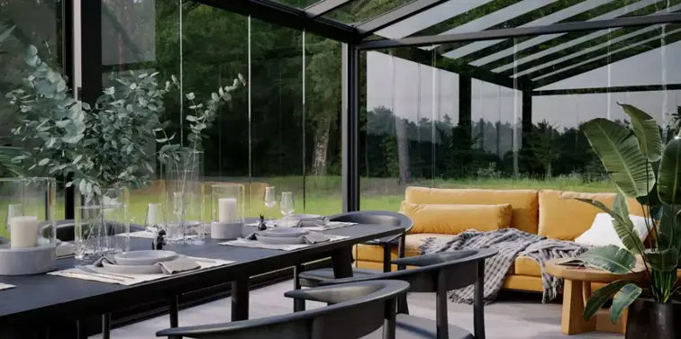 As vigas de suporte laterais do sistema de jardim de inverno se alinham com os perfis de cobertura do telhado para garantir uma aparência estética.