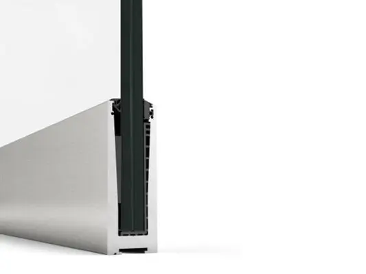 Trata-se de um sistema em “U” desenhado para alojar vidro laminado temperado de segurança e que pode ser instalado tanto sobre a laje como na testa da laje.